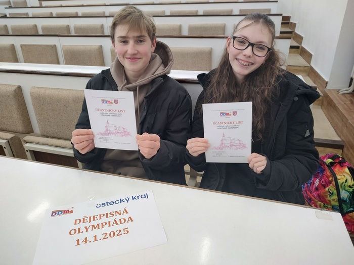 Dne 14. 1. 2025 se dva žáci 9.A zúčastnili okresního kola Dějepisné olympiády a skončili na krásném 8. a 11. místě. Z takového úspěchu máme radost a jsme hrdí na takovou úspěšnou reprezentaci naší školy. Naši žáci obstáli i v konkurenci studentů gymnázií z celého okresu. Mgr. Jitka Žilíková