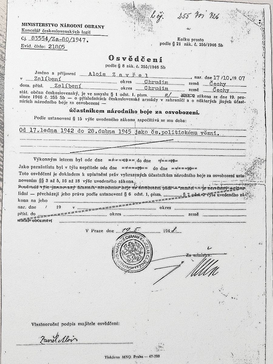Alois Zavřel se narodil 17. 10. 1907 v obci Zalíbené v okrese Chrudim. 17. 1. 1942 byl zatčen nacisty, přesnou příčinu neznám. Byl odvezen do Malé pevnosti Terezín a později do koncentračního tábora v Německu – do Buchenwaldu. Vězněn byl až do 28. 4. 1945. Babička mi říkala, že ani své manželce po návratu moc podrobností nevyprávěl, nerad na útrapy vzpomínal. Zdravotně se s následky špatného jídla a dalšího strádání potýkal až do konce života. Po válce se seznámil v roce 1946 s mou prababičkou, bylo to ve vlaku. Praděda žil ve Šluknově a prababička přišla na sever Čech pracovat do textilky. Byla o 18 let mladší. Vzali se, ale praděda Alois zemřel již v 54 letech, 12. 10. 1961. Příčinou úmrtí byl zhoubný novotvar žaludku – přímý následek válečných útrap.